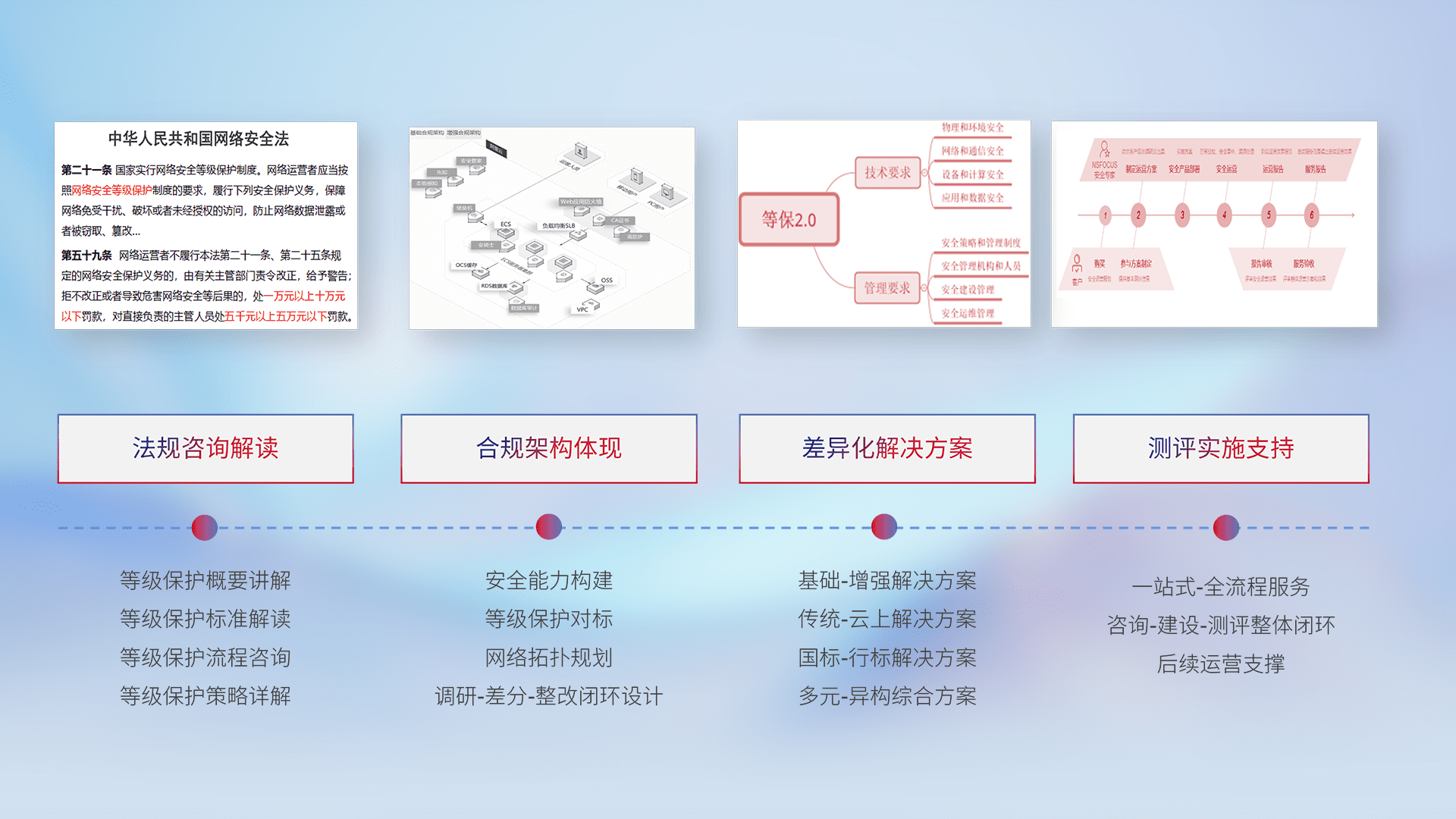 通过专业的法律咨询解读、、、、合规架构体现、、差异化解决方案、、、测试实施支持等服务,,为客户量身打造等保合规体系。。。。